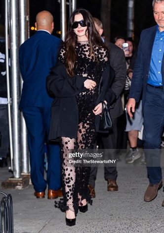 Anne a purtat ținuta numărul 53 Calvin Klein Collection Fall 2026, o rochie neagră din plasă fină, cu noduri mici, decorată cu aplicații florale din organza cu franjuri delicate.